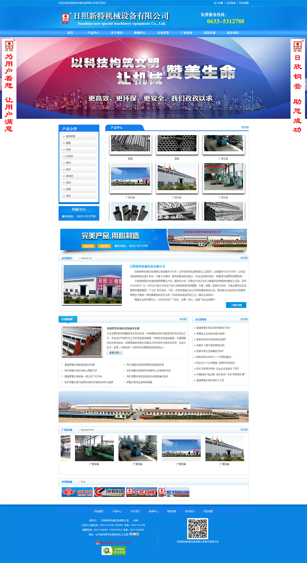 • 日照新特機(jī)械設(shè)備有限公司始建于2001年,位于日照市五蓮縣城北工業(yè)園內(nèi),占地面積7萬余平方米,公司近鄰膠新鐵路五蓮火車站,交通十分便利,境內(nèi)有著名的五蓮山、九仙山旅游風(fēng)景區(qū),有著得天獨(dú)厚的地理優(yōu)勢。 公司擁有國內(nèi)先進(jìn)的高頻焊管生產(chǎn)線、型鋼生產(chǎn)線、縱剪生產(chǎn)線以及與之配套的各種精良機(jī)械加工設(shè)備,總資產(chǎn)5000多萬元。設(shè)計生產(chǎn)能力為年生產(chǎn)加工各種規(guī)格型號的圓管、方管、矩管、型鋼8萬余噸,產(chǎn)品主要供應(yīng)五征集團(tuán)和福田集團(tuán),廣泛應(yīng)用于客車、汽車、農(nóng)用車制造行業(yè)以及民用建筑裝飾行業(yè),是目前山東省內(nèi)較大的高頻焊