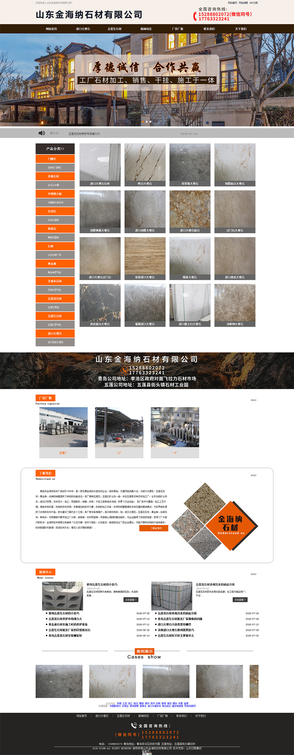 • 青島市金海納石材廠始 創(chuàng)于1998年,是一家發(fā)展起來的大型石材企業(yè)。地處青島,交通網(wǎng)絡四通八達,為進 口大理石、五蓮花石材、黃金麻、白麻的銷售提供了良好的運輸途徑。我廠擁 有五蓮花、五蓮紅礦山各一座,并在五蓮縣設有石材加工廠,業(yè)務包括礦山開采、進出口貿(mào)易、石材設計、加工、異型制作、銷售、安裝、干掛工程等諸多領(lǐng)域,積累了行業(yè)經(jīng)驗。 我廠技 術(shù)力量強,加工工藝不錯,借助本地優(yōu)良的石材資源,依靠強勁的技 術(shù)力量、優(yōu)良的加工設備、科學的質(zhì)量管理體系和完善的營銷模式,為各界朋友提供了多樣的石材產(chǎn)品,參與建設了國