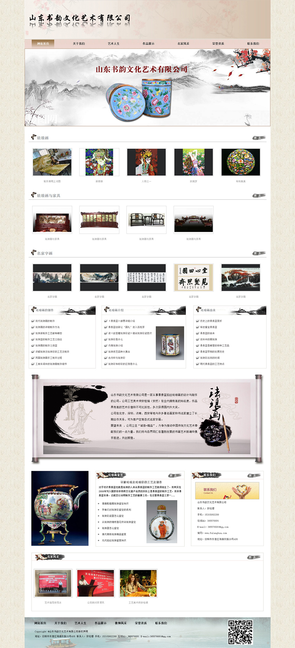 • 山東書韻文化藝術(shù)有限公司是一家從事景泰藍(lán)掐絲琺瑯畫的設(shè)計(jì)與制作的公司。公司工藝美術(shù)師安桂娟(安然)在業(yè)內(nèi)擁 有高的知 名度,作品具有高的藝術(shù)價(jià)值和不能比較性,多次獲得國(guó) 內(nèi)外大獎(jiǎng)。 公司在北京、深圳、濟(jì)南、西安等地與許多著 名畫家和書法家建立了長(zhǎng)期合作關(guān)系,可為客戶定制各式名家字畫。 展望未來(lái) ,公司立足“誠(chéng)信+精 品”,力爭(zhēng)為推動(dòng)中國(guó)傳統(tǒng)文化藝術(shù)奉獻(xiàn)我們的一點(diǎn)力量。我們將與各界同仁在蓬勃發(fā)展的書畫藝術(shù)新潮中攜手前進(jìn),共創(chuàng)輝煌。